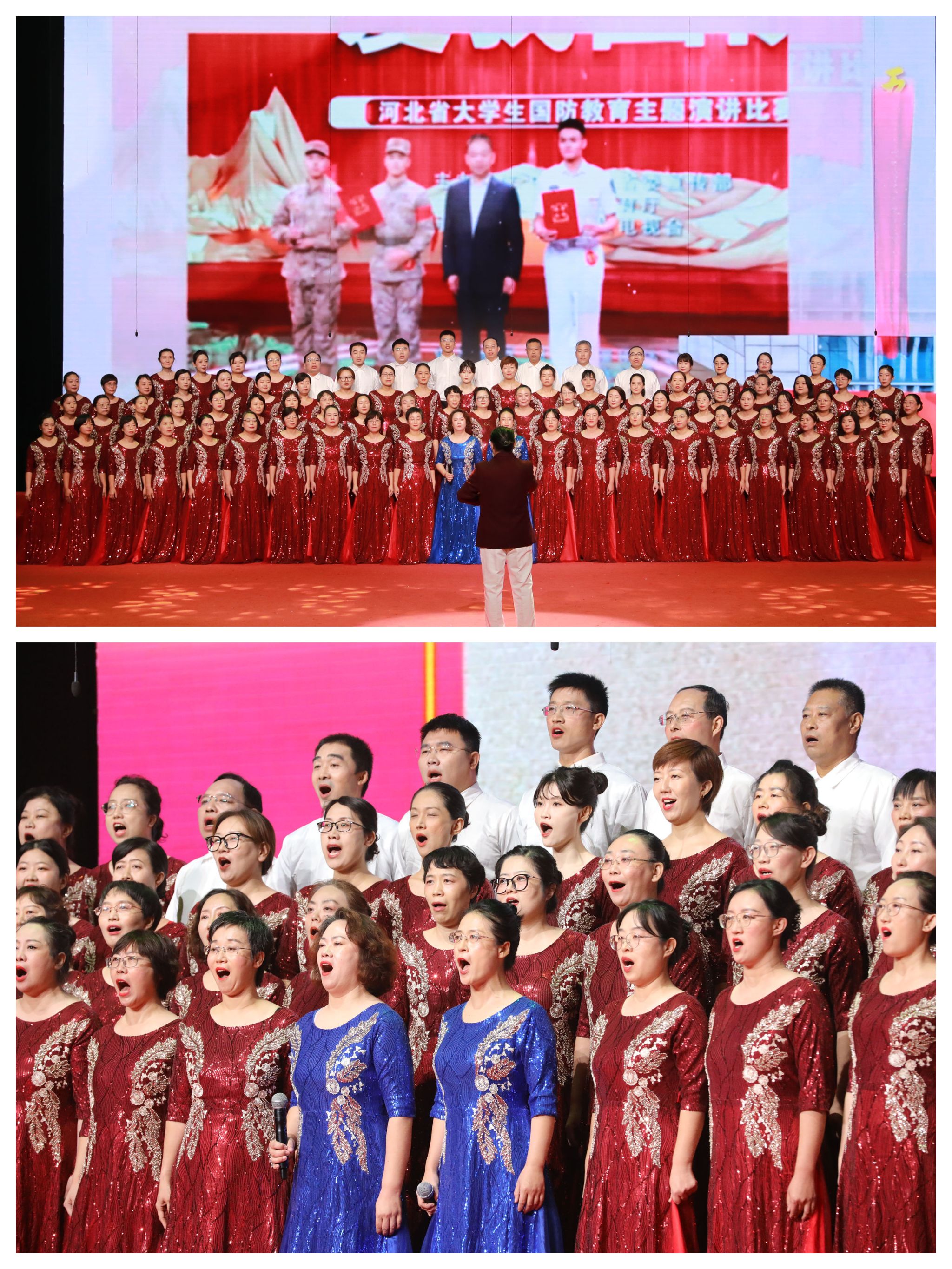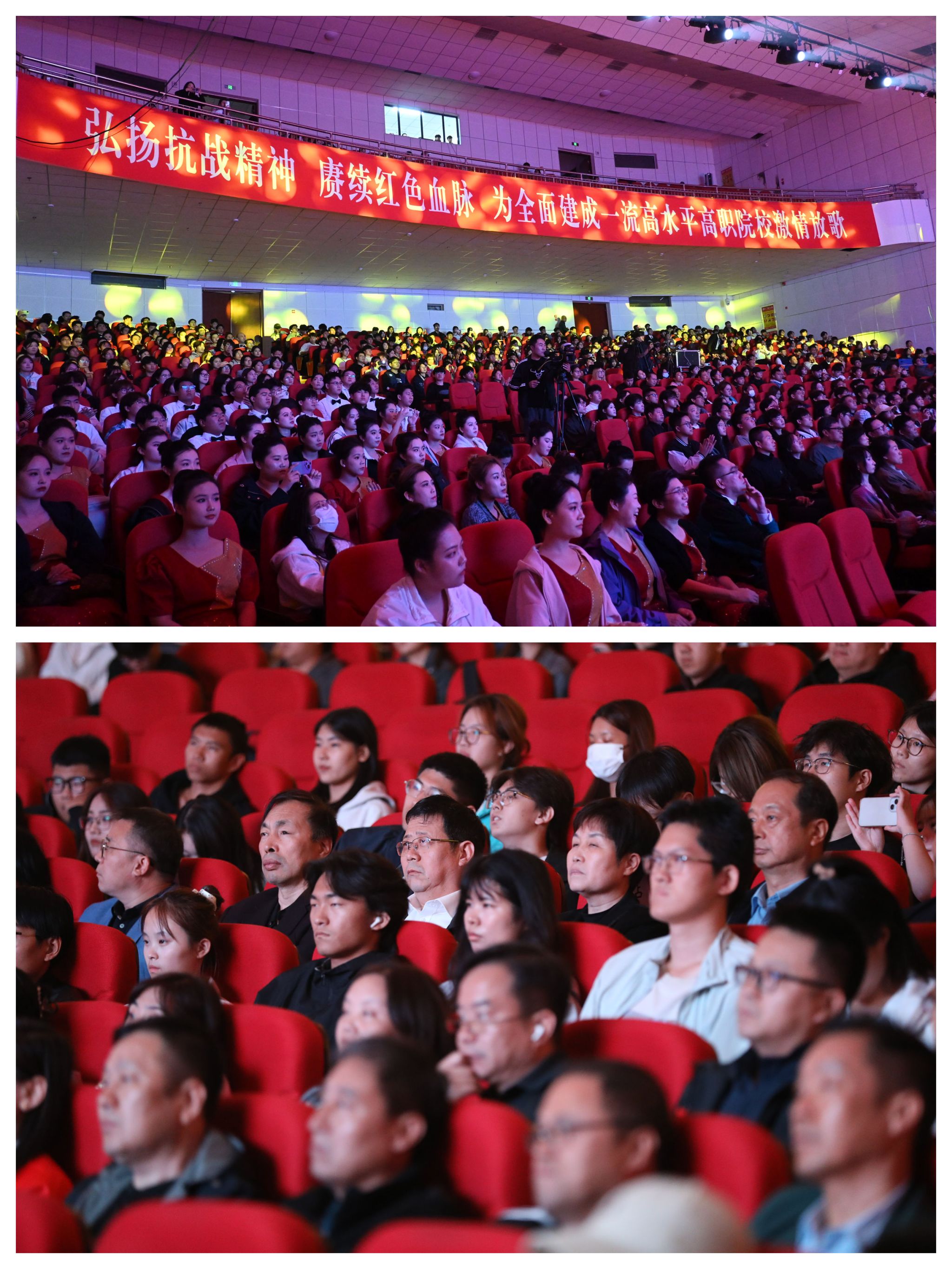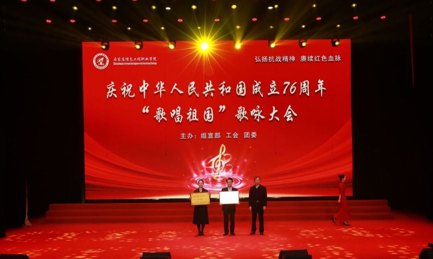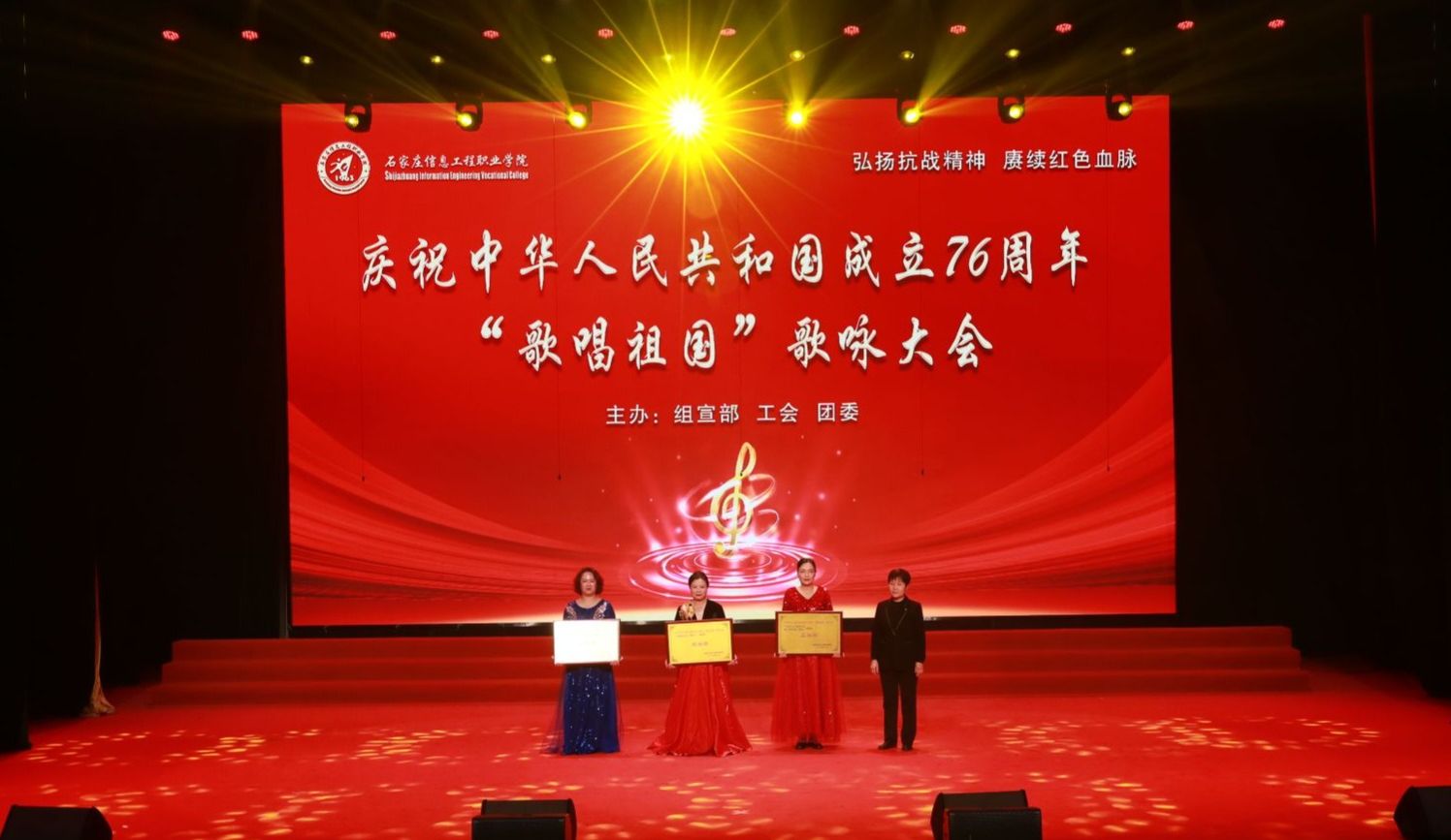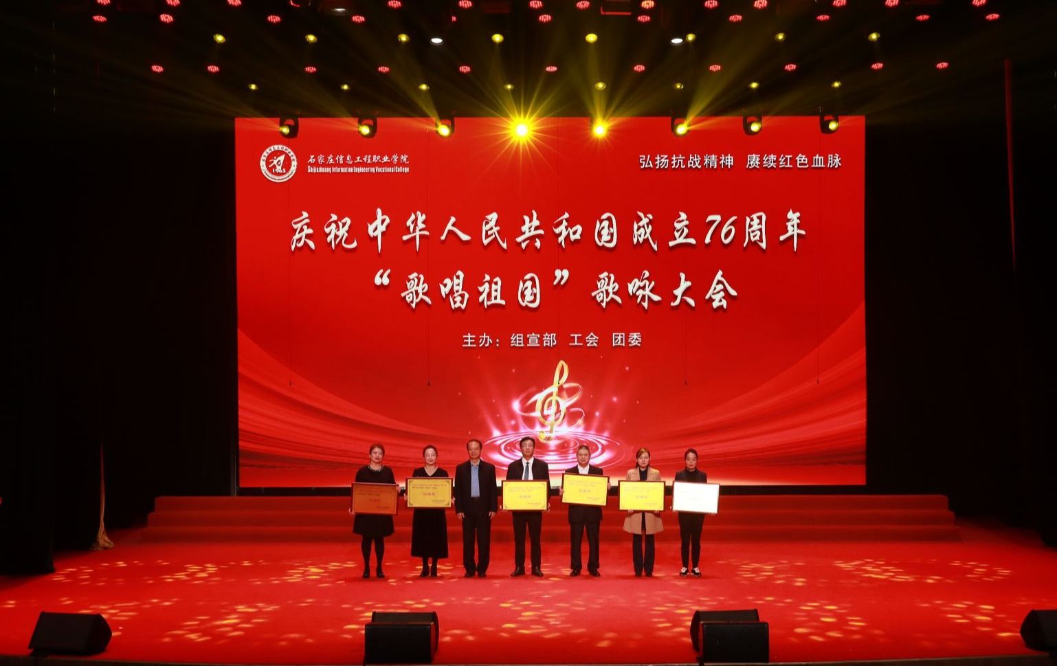 10月16日下午,昭德礼堂歌声悠扬,激情欢快。由组宣部、工会、团委牵头主办的“弘扬抗战精神,赓续红色血脉——庆祝中华人民共和国成立76周年‘歌唱祖国’歌咏大会”高潮迭起、精彩纷呈。副院长赵伟、刘占红,纪委书记赵惠娟,党委委员、工会主席王志明,党委委员、组宣部部长范成宝参加。市委宣传部政研会秘书长张金、市教育局思政科科长肖楠、团市委学少部部长闫妍、市总工会教科文卫工会一级主任科员钟志平、学院退休干部代表王建辉作为嘉宾评委应邀参加。招生就业指导中心主任高永贵,图书馆馆长张振华、人事处处长高平、学生处处长兼团委书记展庆召、外语教育培训部主任张桂萍担任大赛评委。来自学院各系(院、部)的12支合唱队伍参赛,共计千余名师生欢聚一堂,万余名观众通过线上同步观看直播。